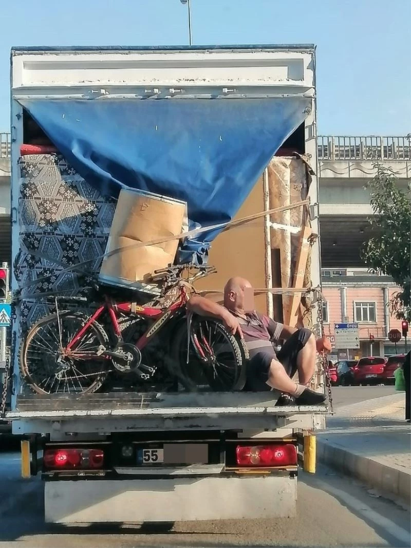 Samsun’da bir vatandaşın eşya dolu kamyonun arkasında akan trafikte keyifle yolculuk etmesi dikkat çekti.