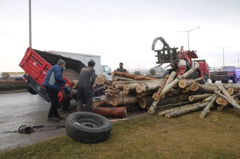 Sivas’ta tekeri yerinden çıkan tomruk yüklü römork yan yattı, yaralanan olmayan kazada tomruklar boş alana devrildi.