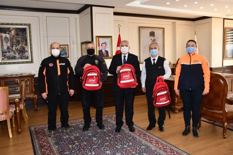Bu kapsamda, İl AFAD Müdürü Recep Erol; Vali Aziz Yıldırım, İl Emniyet Müdürü Mehmet Erduğan ve İl Jandarma Komutanı Kd. Alb. Osman Kılıç’a Afet ve Acil Durum Çantası takdim ederek, çantanın içeriği ve nasıl hazırlanması gerektiği konusunda bilgilendirmede bulundu.