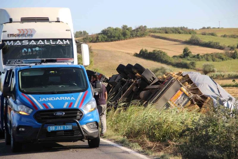 Tekirdağ’ın Malkara ilçesinde saman balyası yüklü tır devrildi. Sürücüsü şans eseri burnu bile kanamadan kendi imkanları ile tırdan çıkmayı başardı.