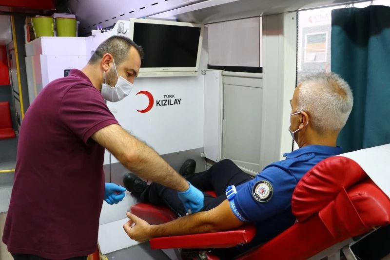 Kızılay’ın kan alma işleminin yapıldığı otobüsüne gelen polisler, burada gerekli formların doldurulması, görevli doktor nezaretinde bilgi verilmesi ve gerekli sağlık kontrollerinin yapılması sonrası kan verdi.