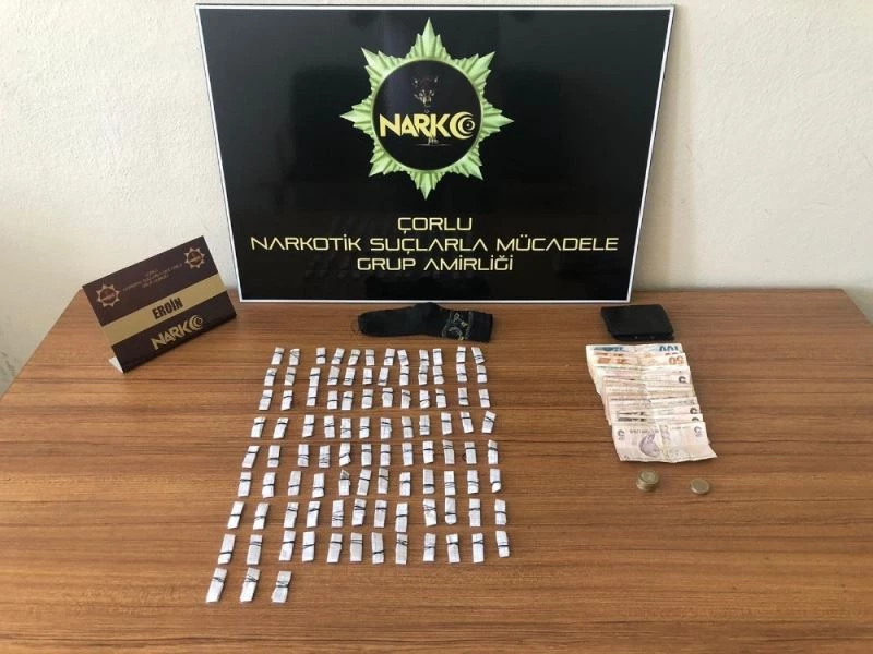 Tekirdağ İl Emniyet Müdürlüğü Narkotik Suçlarla Mücadele Şube Müdürlüğü Çorlu Grup Amirliği görevlilerince Hıdırağa (Kore) Mahallesinde uyuşturucu ve uyarıcı madde satışı yapan şahıslara yönelik çalışma yapıldı. Yapılan çalışmalar kapsamında tespit edilen bir şahsın üzerinde ve yakalandığı yerde bulunan otluk alanda arama yapıldı. Aramalarda fişeklenmiş halde 99 fişek uyuşturucu maddelerden eroin maddesi, uyuşturucu madde satışından elde edildiği değerlendirilen 344.5 TL para ele geçirildi.