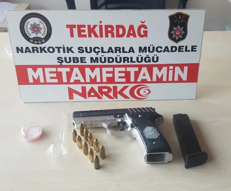 Tekirdağ İl Emniyet Müdürlüğü Narkotik Suçlarla Mücadele Şube ekiplerince Süleymanpaşa ilçesi Hükümet Caddesinde şüpheli bir araç durduruldu. Araçta bulunan C.E. ve M.C.A. isimli şahıslardan, 1 adet plastik kutu icinde 1,7 gram metamfetamin maddesi, 1 adet içerisinde uyuşturucu içmekte kullanılan cam düzenek, 1 adet tabanca ve tabancaya ait şarjör, 10 adet 9 mm dolu fişek ele geçirildi.