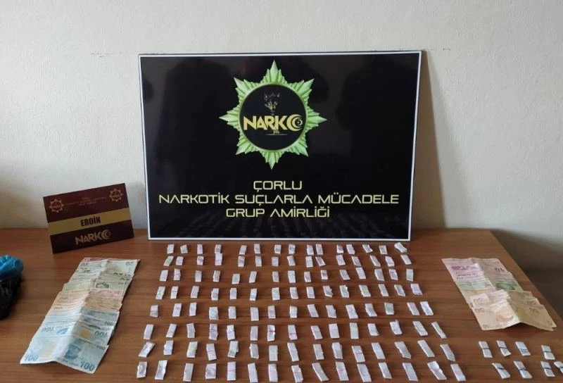 Tekirdağ İl Emniyet Müdürlüğü Narkotik Suçlarla Mücadele Şube Çorlu NSM Grup Amirliği ekipleri, Hıdırağa (Kore) Mahallesinde uyuşturucu ve uyarıcı madde ticareti yapan şahıslara yönelik çalışma gerçekleştirdi. Yapılan çalışmalar kapsamında tespit edilen bir şahsın üzerinde ve ikametinde yapılan aramada, fişeklenmiş halde 147 fişek uyuşturucu maddelerden eroin, uyuşturucu madde satışından elde edildiği değerlendirilen bin 510 TL para ele geçirildi.