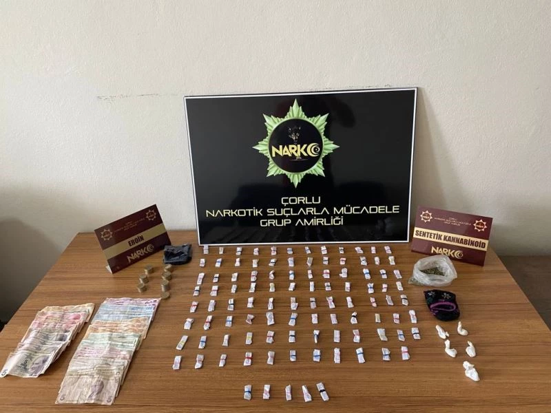 Tekirdağ Narkotik Suçlarla Mücadele Şube Müdürlüğü Çorlu Grup Amirliği görevlilerince, Çorlu ilçesinde iki farklı adreste aynı gün operasyon gerçekleştirildi. Hıdırağa Mahallesi’nde gerçekleştirilen ilk operasyonda O.A. ve A.Ö. isimli iki kişinin üzerinde arama yapıldı. Polisin yaptığı aramada 2 gram eroin, 4 adet uyuşturucu hap, 8 gram sentetik kannabinoid ele geçirildi. Uyuşturuculara el konulurken, zanlılar ise gözaltına alındı.