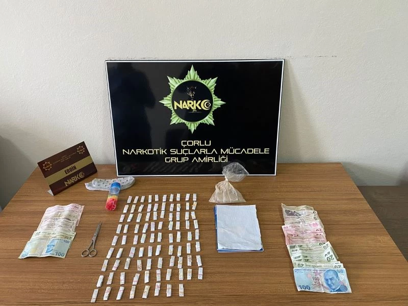 Tekirdağ İl Emniyet Müdürlüğü Narkotik Suçlarla Mücadele Şube Çorlu Grup Amirliği ekiplerince Çorlu ilçesi Cemaliye Mahallesi’nde uyuşturucu ve uyarıcı madde ticareti yapan şahıslara yönelik operasyon düzenlendi. Yapılan çalışmalar kapsamında tespit edilen bir ikamette yapılan aramada, 48 gram uyuşturucu maddelerden eroin, 88 fişek uyuşturucu maddelerden eroin, uyuşturucu madde satışından elde edildiği değerlendirilen 905 TL para, uyuşturucu madde fişeklemesinde kullanılan renkli saç tokaları, kesilmiş defter sayfaları ve 1 adet makas ele geçirildi.