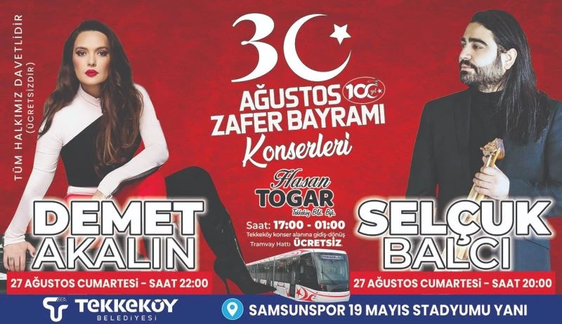 Tekkeköy Belediyesi tarafından 27 Ağustos günü Samsunspor 19 Mayıs Stadyumu yanındaki etkinlik alanında Zafer Bayramı konserleri düzenlenecek. 30 Ağustos Zafer Bayramı’nın 100. yıl coşkusu Karadeniz müziğinin özgün sesi Selçuk Balcı ve pop müziğin güçlü ismi Demet Akalın’ın sahne alacağı konserlerle kutlanacak. Saat 20.00’de Selçuk Balcı ve 22.00’de Demet Akalın sahneye çıkacak.