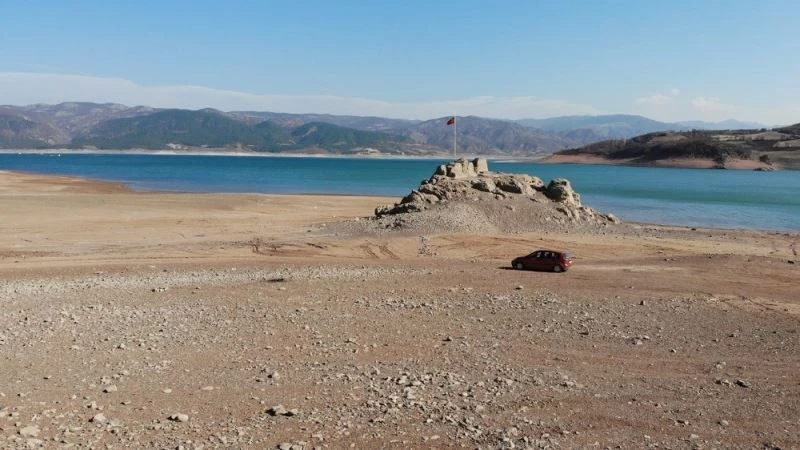 Tokat’ta baraj gölünde su seviyesinin düşmesi sonucu vatandaşlar, tekneyle gidilebilen kayalıklara artık otomobilleri ile gidebiliyor.