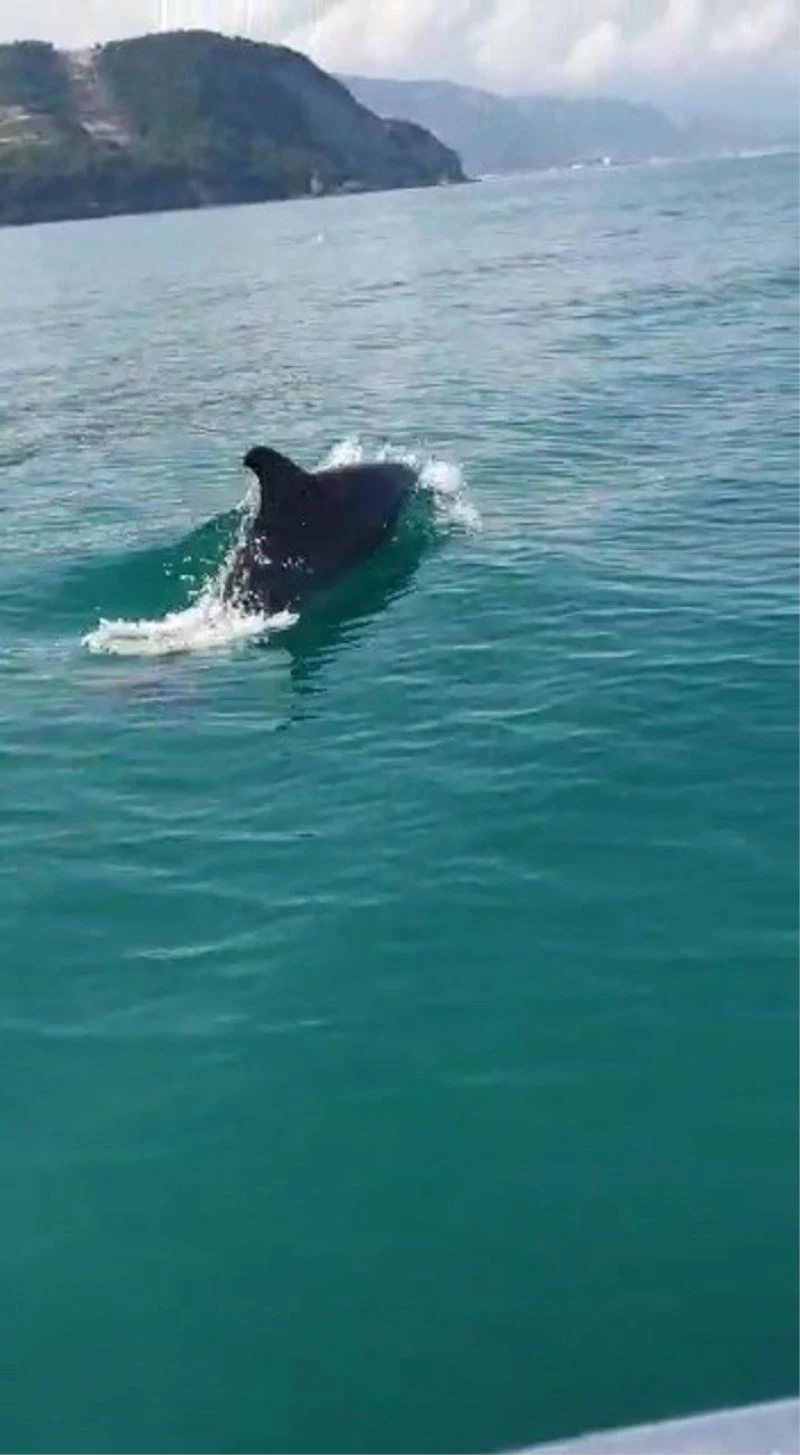 Kastamonu’nun Cide ilçesinde tekneyle yarışan yunus balıkları, cep telefonu ile görüntülendi.