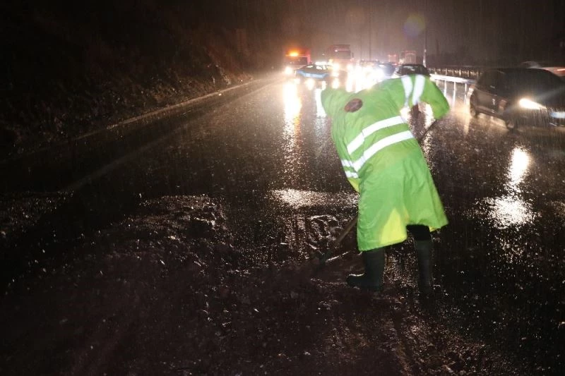 Kocaeli’nin Körfez ilçesi TEM Otoyolu’nda aşırı yağışlar sonucu yamaçtaki toprak yola aktı. İstanbul istikametinde tek şeride düşen yolda yaklaşık 10 kilometrelik araç kuyruğu oluştu.