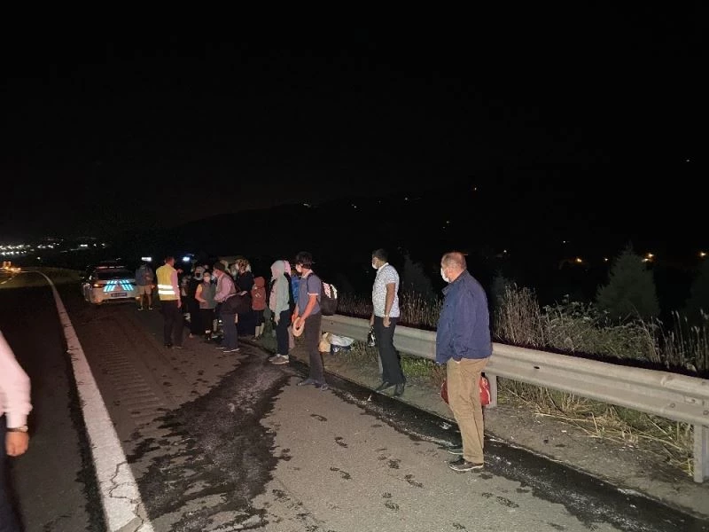 DÜZCE (İHA) – Düzce TEM Otoyolu Gümüşova rampalarında yolcu otobüsü motor kısmından alev alarak yanmaya başladı. Dumanı gören şoför otobüsü emniyet şeridine çekerken, yolcular tahliye edildi.