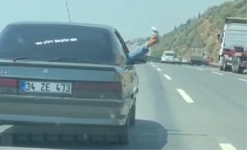Kocaeli’nin Körfez ilçesi TEM Otoyolunda seyir halindeki otomobilin camından bacağını sarkıtan bir kişinin tehlikeli yolculuğu, başka otomobilde bulunan bir vatandaşın cep telefonu tarafından görüntülendi.