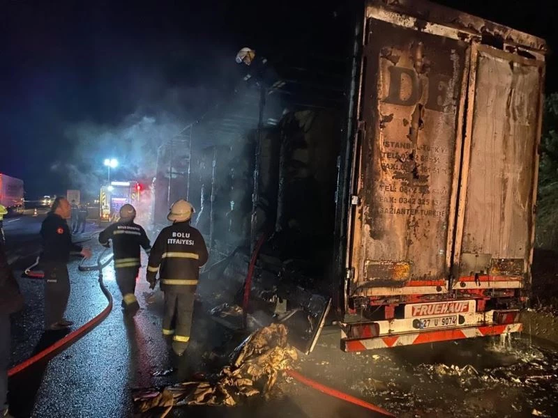 Bolu’da TEM Otoyolu’nda seyir halindeyken yanan kağıt yüklü tır kullanılamaz hale geldi.