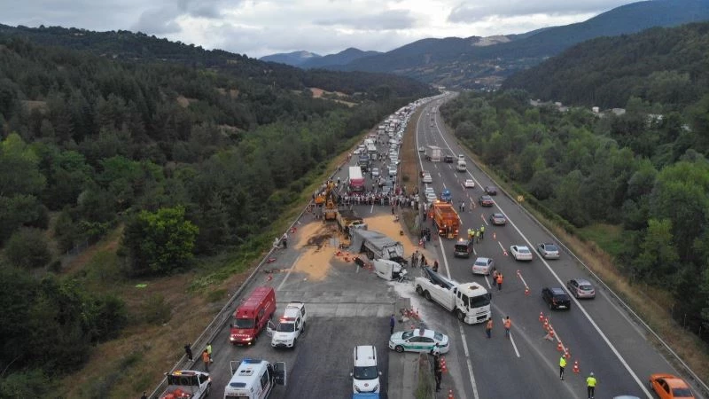 Bolu’da, TEM Otoyolu’nda 1 kamyon ve 3 tırın karıştığı zincirleme trafik kazasında, tırın altına giren kamyon sürücüsü hayatını kaybederken, 1’i ağır 2 kişi yaralandı. Kaza sebebiyle ulaşıma kapatılan otoyolda kilometrelerce kuyruk oluştu.