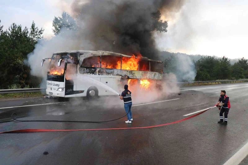 Bolu’da, TEM Otoyolu’nda seyir halinde olan yolcu otobüsü alev alev yandı. Olayda can kaybı yaşanmazken yolcu otobüsü tamamen kullanılamaz hale geldi.