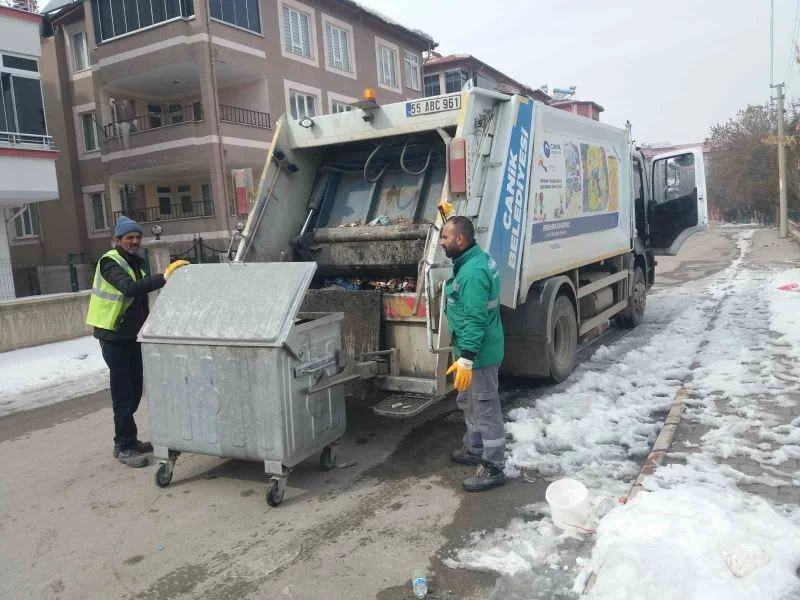 Ekipler, Canik Belediyesi’nden bölgeye sevk edilen çöp toplama kamyonları ile temizlik ve hijyen sorunun oluşmaması ve salgın hastalık riskine karşı özenle çalışmalarını gerçekleştiriyor.