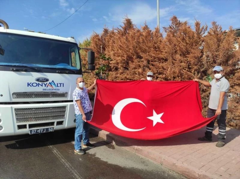 Konyaaltı Belediyesi'nde görevli temizlik işçileri Turan Sağlam, Mehmet Ali Koral ve Adnan Alagöz, Pınarbaşı Mahallesi 739 Sokak'taki çöpleri topladıkları konteynerde Türk bayrağı olduğunu fark etti.