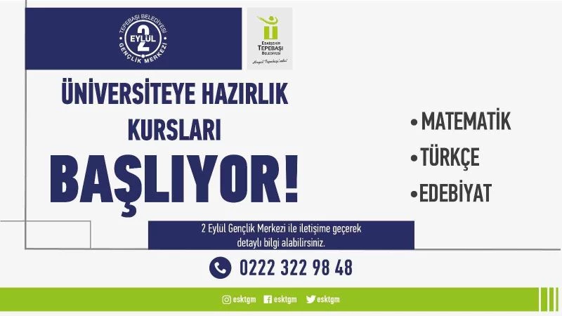 Tepebaşı Belediyesi, gençlerin eğitimlerini her alanda desteklemeye devam ediyor. Bu kapsamda 2 Eylül Gençlik Merkezi’nde üniversiteye hazırlık kursları için kayıtlar başladı. Matematik, Türkçe ve edebiyat dersleri için gerçekleştirilecek olan kurslar, ücretsiz olarak düzenlenecek. Üniversite sınavına hazırlanan gençlerin katılabileceği kurslar hakkında bilgi almak isteyenler, 0 (222) 322 98 48 numaralı telefondan yetkililere ulaşabiliyor. 2 Eylül Gençlik Merkezi, Sütlüce Mahallesi, İstiklal Caddesi Numara 148 adresinde hizmet veriyor.