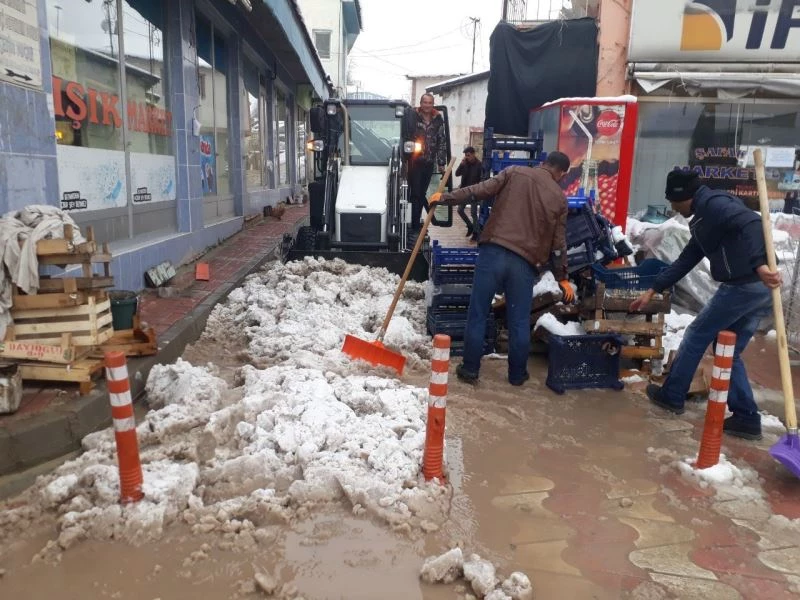 Yoğun kar yağışının ardından belediye ekipleri ilçe merkezindeki cadde ve sokaklarda kar temizleme çalışmalarına aralıksız devam ediyor.