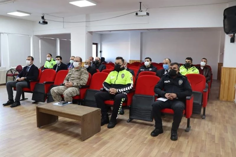 Toplantıda yoğun kar yağışı ve don kapsamlı meteorolojik uyarılar başta olmak üzere kış şartları dolayısıyla yerleşim birimlerinde genel hayati etkileyeceği değerlendirilen can ve mal zararlarının önlenmesi/azaltılması, müdahale çalışmalarının daha etkin ve verimli yapılabilmesi amacıyla alınması gereken tedbirler tüm yönleriyle el alındı. Köylere Hizmet Götürme Birliği Toplantı salonunda Kaymakam Musa Kazım Çelik başkanlığında gerçekleşen toplantıya, belediye başkanları ve ilgili kurum müdürleri katıldı. Toplantıda konuşan Kaymakam Çelik, “Kazasız belasız, yaralanmasız, maddi kayıpsız, can kaybı yaşamadığımız bir kış sezonu geçirmeyi diliyorum” dedi.