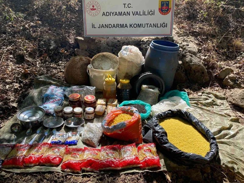 Adıyaman İl Jandarma Komutanlığı tarafından yapılan çalışmalarda terör örgütü PKK’ya ait toprağa gömülü yaşam malzemeleri ele geçirildi.