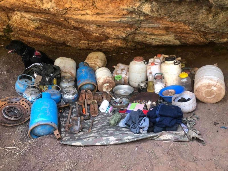 Topraktan 2 adet 12 kilogramlık tüpü, 5 adet 2,5 kilogramlar piknik tüpü, 9 adet 15 litre boş bidon, 5 kilogram çay, 4 adet 5 litre bidon, 5 kilogram tuz, 1 adet çaydanlık, 1 adet tencere, 1 adet tava, 1 adet tava saç, 3 adet keser, 1 adet çekiç, 1 adet murç, 1 adet ağaç testeresi, 1 adet metre, 1 top ip, 1 paket traş jileti, 1 adet şişe içerisinde 2,5 litre sıvı yağ, 50 adet sigara kağıdı, 63 adet pil, 1 adet aydınlatma feneri, 5 adet not defteri, 1 adet radyo,1 adet flash bellek, 3 adet çakmak taşı, 3 çift ayakkabı, 1 adet bere, 3 adet hırka ve 13 çift çorap çıkartıldı.