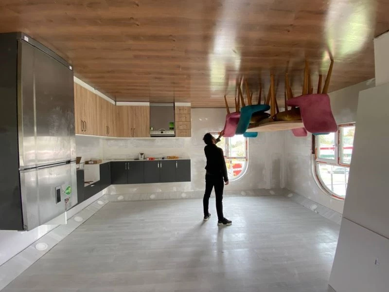 Sakarya Büyükşehir Belediyesi tarafından yapımına başlanan Ters Ev projesi tamamlanıyor. 300 metre kare alan üzerine inşa edilen 190 metrekarelik Ters Ev’in içerisinde devam eden montaj çalışmaları tamamlandığında, Sakarya yeni sosyal yaşam alanına kavuşacak.