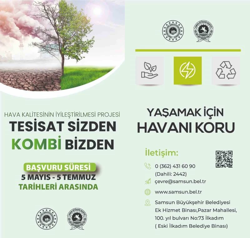 ‘Yaşamak için havanı koru’ anlayışıyla yola çıkan Samsun Büyükşehir Belediyesi ile Çevre, Şehircilik ve İklim Değişikliği Bakanlığı, ısınmadan kaynaklı hava kirliliğini önlemek amacıyla ‘Hava Kalitesinin İyileştirilmesi Projesi’ni hayata geçirdi. Proje ile birlikte ısınma amaçlı katı yakıt kullanımının önüne geçilmesi ve bu sayede hava kalitesinin iyileştirilmesi planlanıyor. Bu amaçla; evlerinde doğalgaz tesisatı yaptırmış fakat kombisi olmadığı için aktif olarak doğalgaz kullanamayan veya proje başvurusu süresi içerisinde kombi tesisatının inşaatını tamamlamış olan vatandaşlara, Büyükşehir Belediyesi tarafından kombi desteği verilecek.