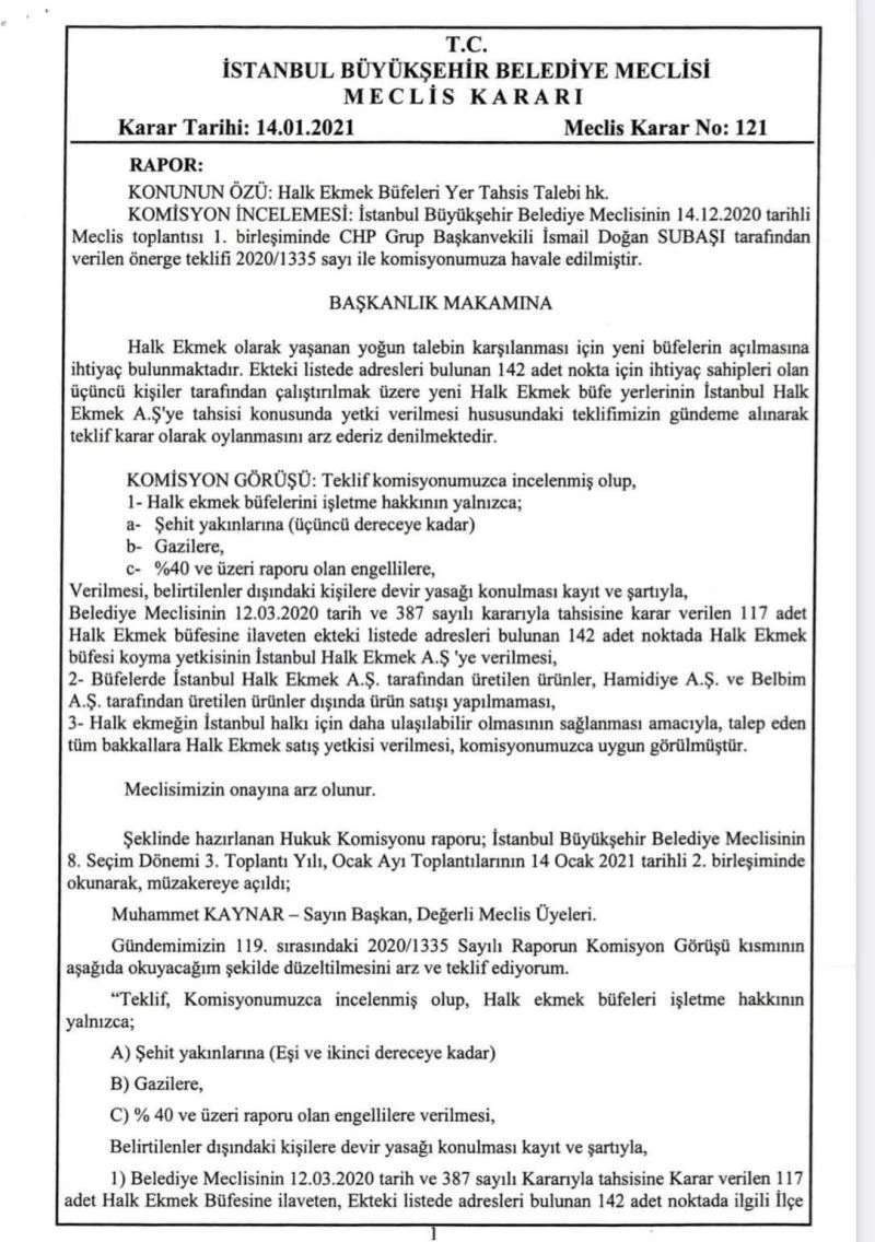 Öte yandan İBB Meclis Kararı’nda da bulunan bu şartlara ek olarak, “İlçe belediyesinden imar ve şehircilik yönünden uygun görüş alınmak kaydıyla Halk Ekmek büfesi koyma yetkisi” şartı da yer alıyor.