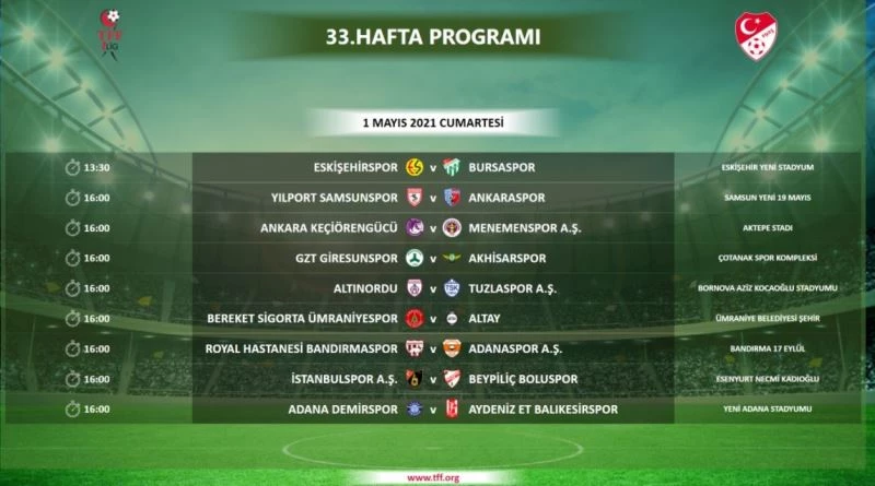 TFF 1. Lig’in 33. haftasında oynanacak müsabakaların programı açıklandı. Buna göre tüm maçlar 1 Mayıs Cumartesi günü yapılacak.