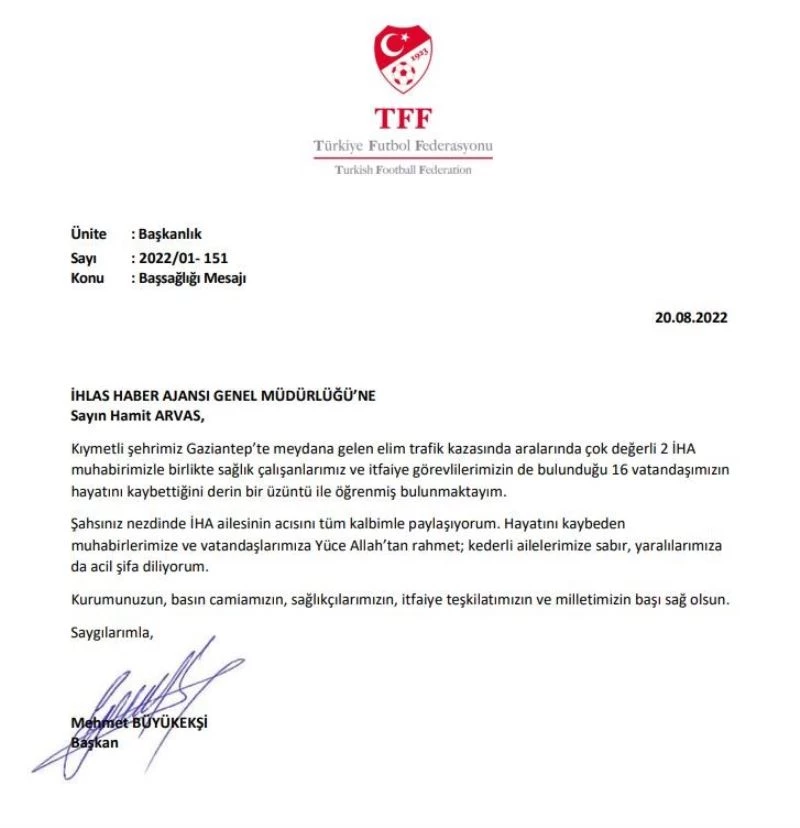 Türkiye Futbol Federasyonu Başkanı Mehmet Büyükekşi, Gaziantep’te yaşanan kazada hayatını kaybeden İhlas Haber Ajansı muhabirleri Umut Yakup Tanrıöver ile Muhammed Abdulkadir Esen için taziye mesajı gönderdi.