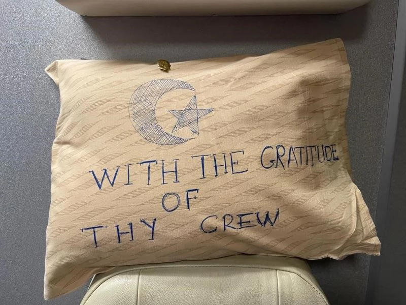 THY’nin TK1357 sefer sayılı İstanbul-Madrid uçağında, deprem bölgelerine yardım için gelen ve ülkelerine dönen İspanyol arama kurtarma ekibi de yer aldı. Uçaktaki kokpit ve kabin ekibi, teşekkür amacıyla yastığın bir yüzüne ay-yıldız çizip ‘’With the gratitude of Cabin Crew’’ yazdı. Diğer yüzüne ise kabin ve kokpit ekibinin isimleri yazılıp bröveleri takılarak, İspanyol arama-kurtarma ekibine hediye edildi. İspanyol arama kurtarma görevlileri, kabin ekibinin jesti karşısında duygu dolu anlar yaşadı.