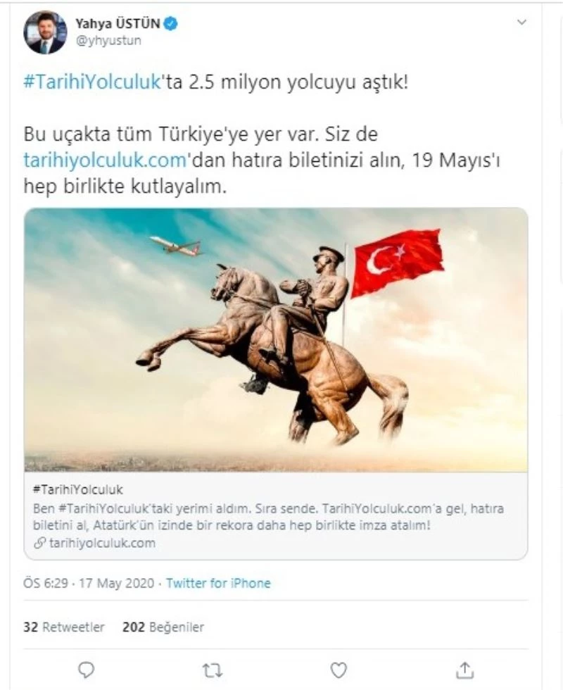 Türk Hava Yolları Basın Müşaviri Yahya Üstün, resmi sosyal medya hesabı üzerinden yaptığı açıklamada, "Tarihi Yolculuk’ta 2.5 milyon yolcuyu aştık. Bu uçakta tüm Türkiye’ye yer var. Siz de http://tarihiyolculuk.com’dan hatıra biletinizi alın, 19 Mayıs’ı hep birlikte kutlayalım" ifadelerini kullandı.