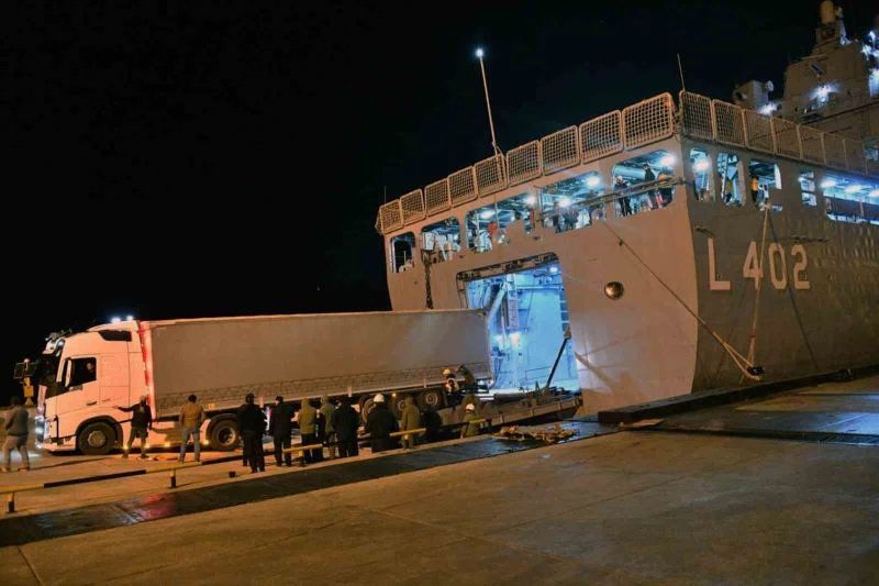 Deprem bölgesine ulaştırılmak üzere yola çıkan askeri gemilerde ilaç, serum, sargı bezi, enjektör, pansuman malzemesi, oksijen maskesi, alçı/atel, elastik bandaj, boyunluk, muayene eldiveni, cerrahi eldiven, pamuk, hasta alt bezi gibi tıbbi malzemeler; bebek maması, bebek bezi, battaniye, biberon, ısıtıcı, kışlık kıyafetlerden oluşan insani araç gereçler, ambulanslar ve iş makineleri de bulunuyor.