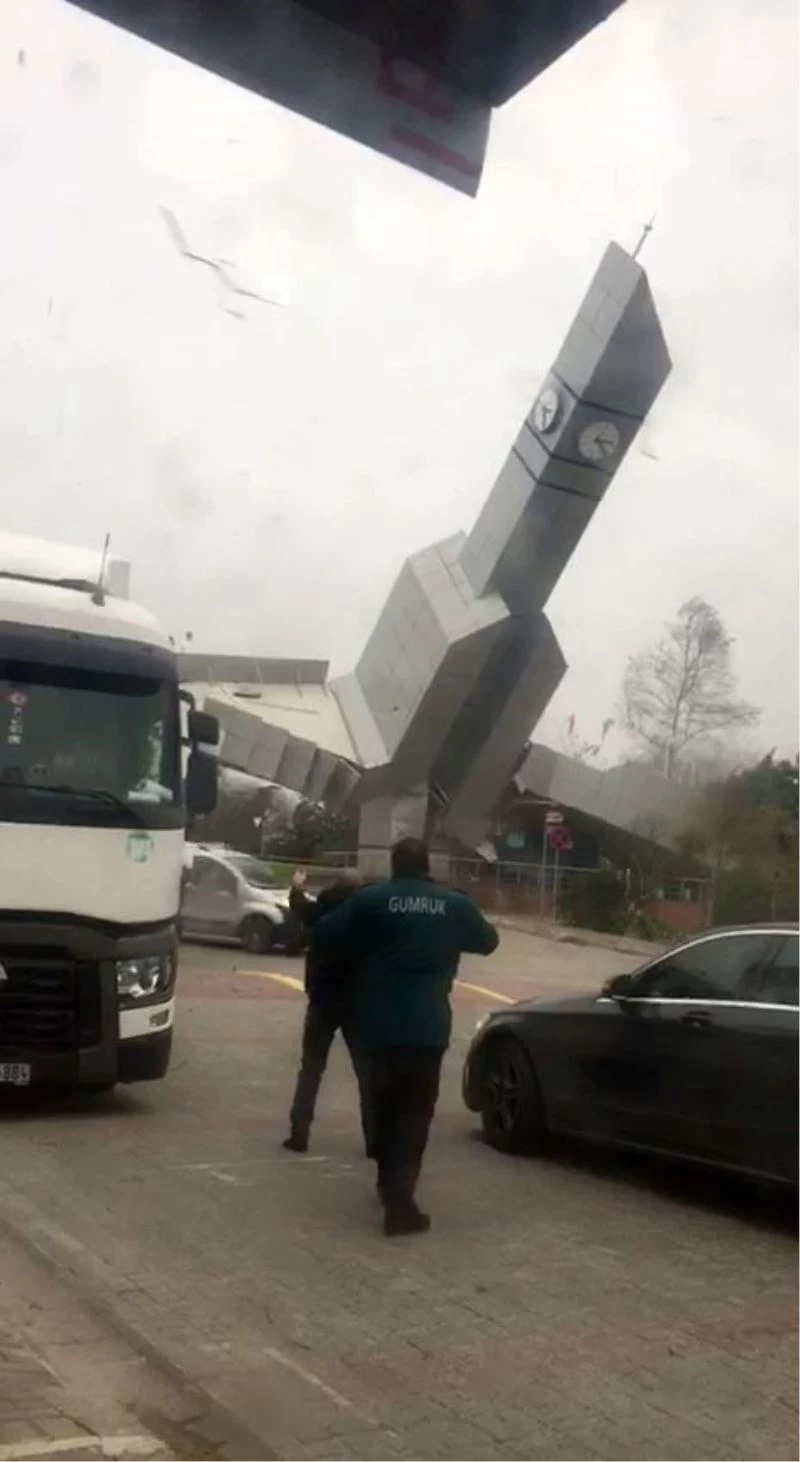 Ticaret Bakanlığı İstanbul Trakya Serbest Bölge Müdürlüğü’ndeki saat kulesi şiddetli rüzgara dayanamazken çevrede yaşanan panik kameraya yansıdı. İki aracın ise kule yere düşmeden hemen önce kurtulduğu görülüyor.