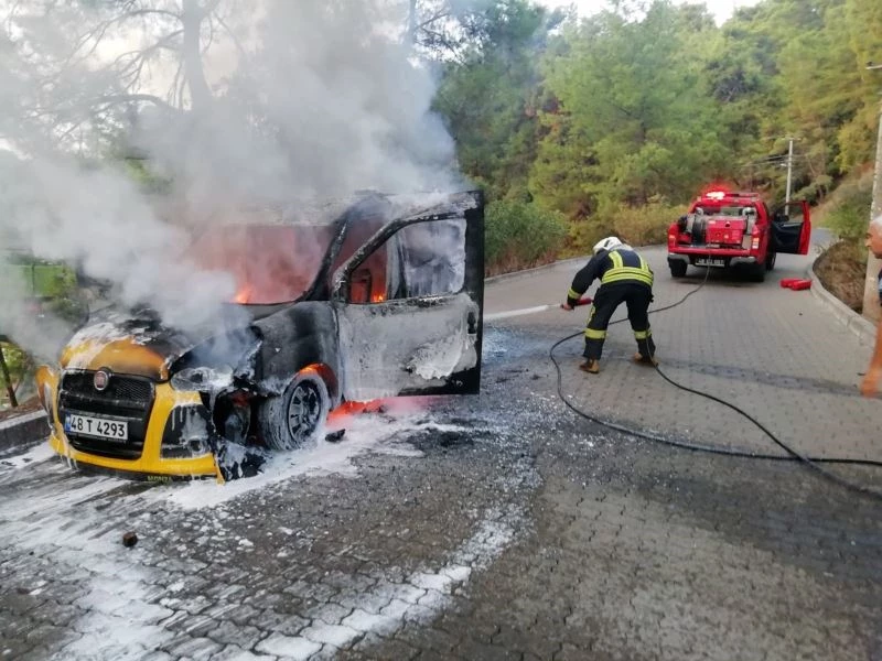 Anmutalan Mahallesi Sarıca yolunda seyir halinde olan ticari taksinin motor bölümünden aniden dumanlar yükselmeye başladı. İçinde yolcu bulunmadığı öğrenilen ticari taksinin yanması sonucu 112 Acil Çağrı Merkezine ihbar yapılması sonrası Büyükşehir Belediyesi Marmaris İtfaiye Grup Amirliği ekipleri sevk edildi.