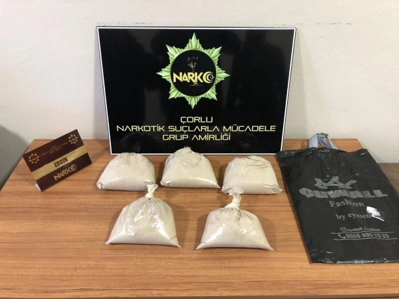 Tekirdağ İl Emniyet Müdürlüğü Narkotik Suçlarla Mücadele Şube Müdürlüğü Çorlu Grup Amirliği ekiplerince gerçekleştirilen operasyonda 5 kilogram uyuşturucu eroin maddesi ele geçirildi.