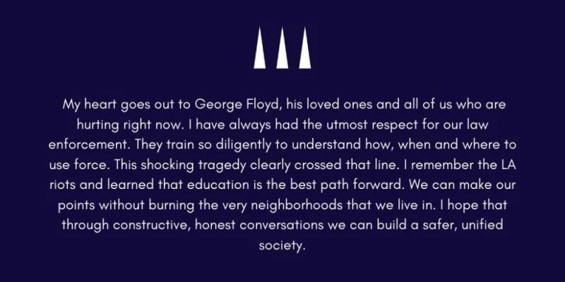 “Güvenlik görevlilerine her zaman sonsuz bir saygı duydum. Güçlerini nerede, ne zaman ve nasıl kullanacakları konusunda son derece titiz bir eğitimden geçiyorlar. Ancak, bu şok edici trajedide çizgiyi aştılar. Los Angeles’taki ayaklanmalarını hatırlıyorum ve eğitimin ileriye yönelik en iyi yol olduğunu öğrendim. Komşularımızın yaşadığı yerleri ateşe vermeden de bir çözüm yolu bulabiliriz. Yapıcı ve dürüst diyaloglarla daha güvenli, birbirini destekleyen bir toplum oluşturabileceğimize inanıyorum.”