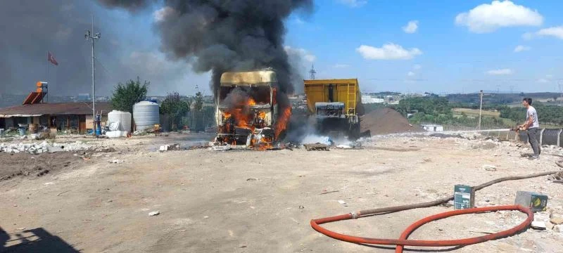 Kocaeli’nin Gebze ilçesinde bir geri dönüşüm fabrikası sahasında bulunan tır alevlere teslim oldu.
