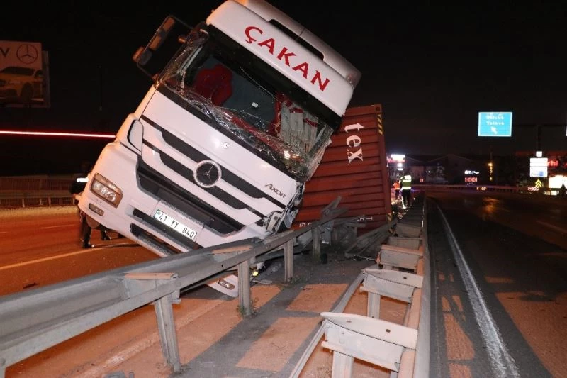 Kocaeli’nin Başiskele ilçesi D-130 karayolunda bir otomobilin sıkıştırdığı tır bariyerlere devrildi, kazada tır sürücüsü yaralandı.