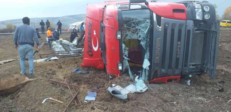Çorum’da sürücüsünün direksiyon hakimijyetini kaybetmesi sonucu kontrolden çıkan tır şarampole devrildi. Kazada 7 büyükbaş hayvan telef oldu.