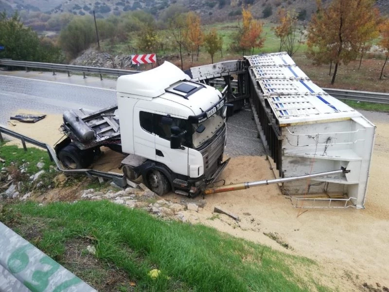 Kaza, saat 10.00 sıralarında İzmir-Ankara D300 karayolu Yurtbaşı Mahallesi yakınlarında meydana geldi. Edinilen bilgiye göre, Muhsin Ü. (59) idaresindeki 38 VF 175 plakalı buğday yüklü tır, İzmir yönüne doğru seyir halindeyken yağışlı havanın etkisiyle kayganlaşan virajlı yolda kontrolden çıktı. Sürücüsünün direksiyon hakimiyetini kaybettiği tır, yan yatarak İzmir-Ankara D300 karayolunun İzmir istikametini trafiğe kapattı. Yan yatan tır içerisindeki sürücü ise yaralandı. Olay yerine gelen 112 acil sağlık ekipleri tarafından ilk müdahalesi olay yerinde yapılan Muhsin Ü., Kula Devlet Hastanesi’ne kaldırılarak tedavi altına alındı. Yaralı sürücünün bacağında kırıklar olduğu, hayati tehlikesinin bulunmadığı öğrenildi.