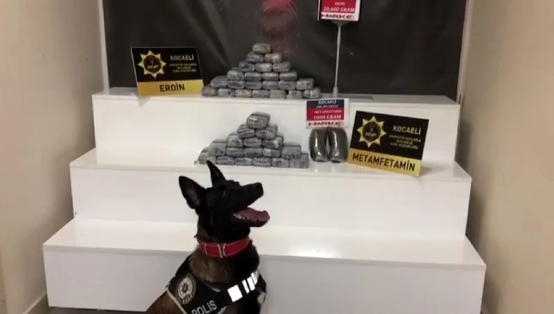 Kocaeli İl Emniyet Müdürlüğü Narkotik Suçlarla Mücadele Şube Müdürlüğü ekipleri, TEM Otoyolu üzerinde şüpheli görülen tır durdurdu. Tırda narkotik köpeği Talisca ile arama yapan ekipler, köpeğin aracın torpido kısmına yoğunlaşması üzerine araçta detaylı arama başlattı. Torpidoyu söken ekipler, aracın ön göğüs boşluğu içerisinde gizlenmiş vaziyette 40 paket halinde 20 kilo 600 gram eroin ve 2 paket halinde 1 kilogram da metamfetamin maddesi ele geçirildi. Uyuşturuculara ve tıra el koyan polis ekipleri, araç sürücüsünü ise gözaltına aldı. Olay hakkında inceleme başlatıldı.