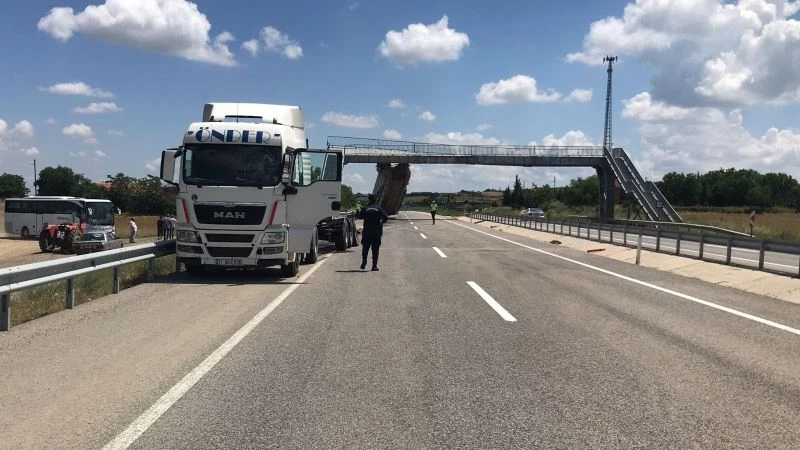 Tekirdağ’ın Malkara ilçesinde tırın açık kalan dorsesi üst geçide çarparak asılı kaldı. Dorseden kopan çekicinin sürücüsü yaralandı.