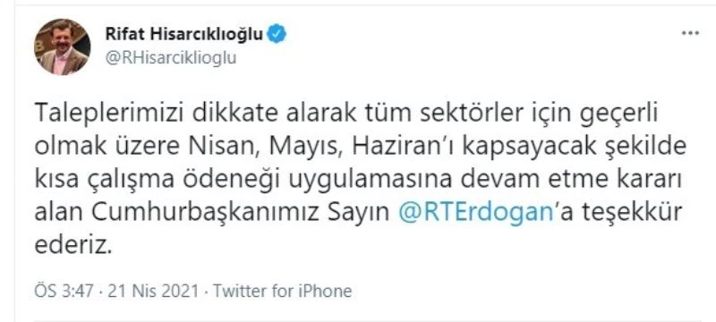 TOBB Başkanı Rifat Hisarcıklıoğlu, kısa çalışma ödeneğinin uzatılmasına ilişkin sosyal medya hesabından yaptığı paylaşımda, "Taleplerimizi dikkate alarak tüm sektörler için geçerli olmak üzere nisan, mayıs, haziranı kapsayacak şekilde kısa çalışma ödeneği uygulamasına devam etme kararı alan Cumhurbaşkanı Recep Tayyip Erdoğan’a teşekkür ederiz" ifadelerini kullandı.