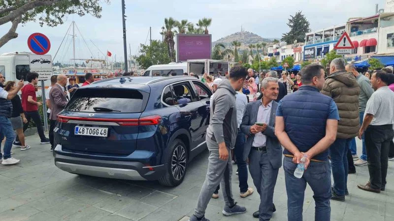 Türkiye’nin yerli otomobili Togg, Muğla’nın Bodrum ilçesinde vatandaşların yoğun ilgisi ile karşılandı. Vatandaşlar, otomobilin önünde ve içerisinde fotoğraf çektirebilmek için birbirleriyle yarıştı.