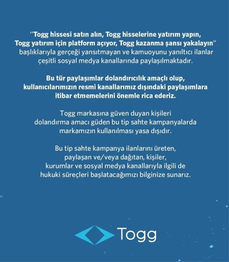 Konuya ilişkin bilgilendirmede, bu tür paylaşımların dolandırıcılık amaçlı olup, kullanıcıların resmi kanallar dışındaki paylaşımlara itibar etmemelerine dikkat çekildi. Açıklamada, "Togg markasına güven duyan kişileri dolandırma amacı güden bu tip sahte kampanyalarda markamızın kullanılması yasa dışıdır. Bu tip sahte kampanya ilanlarını üreten paylaşan veya dağıtan, kişiler kurumlar ve sosyal medya kanallarıyla ilgilide hukuki süreçler başlatacağımızı bilginize sunarız" denildi.