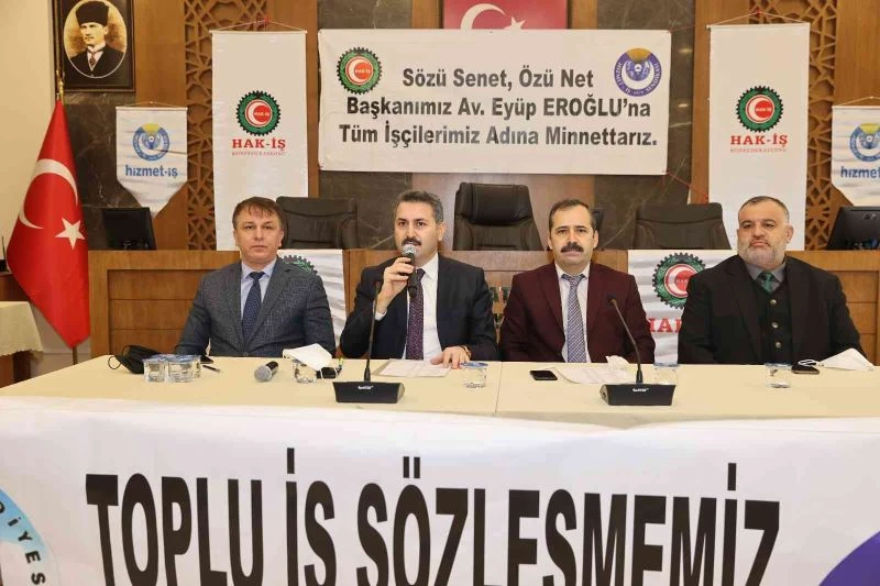 Hak-İş Tokat İl Temsilcisi ve Hizmet-İş Tokat Şube Başkanı Resul Demir ise konuşmasına toplu iş sözleşmemiz iki yıllık bir süreci kapsadığını belirterek, “Sözleşmemiz en iyi sözleşme oldu. Sözleşmemize katkı sağlayan, ücretlerimizi en iyi derecede artırarak imzalayan Belediye Başkanımız Eyüp Eroğlu’na teşekkür ediyorum” diye konuştu