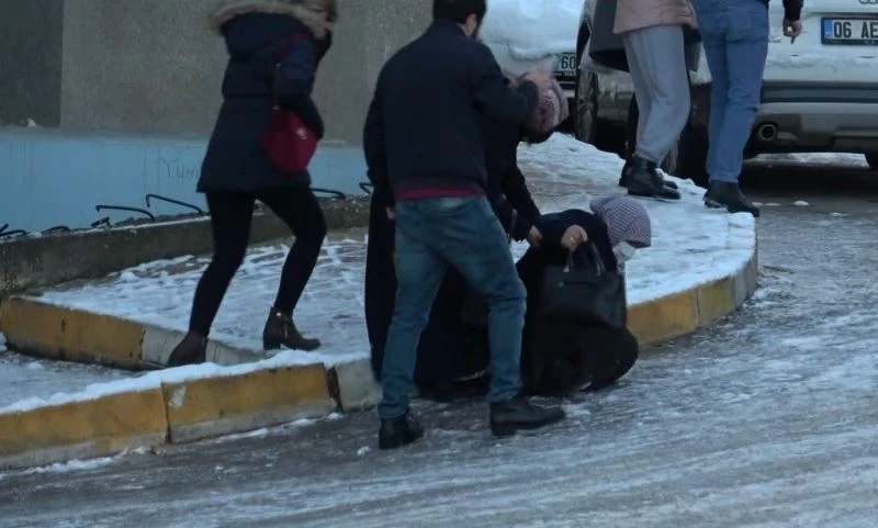 Tokat’ta kar yağışı sonrasında oluşan buzlanma nedeniyle araç sürücüleriyle yayalar zor anlar yaşadı.