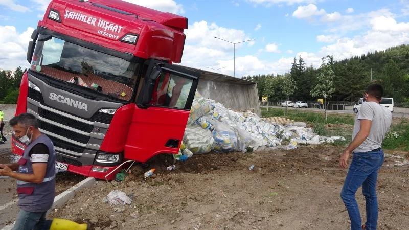 Tokat’ta lastiğinin patlaması sonucu yan yatan tırın sürücüsü kazayı yara almadan atlattı.